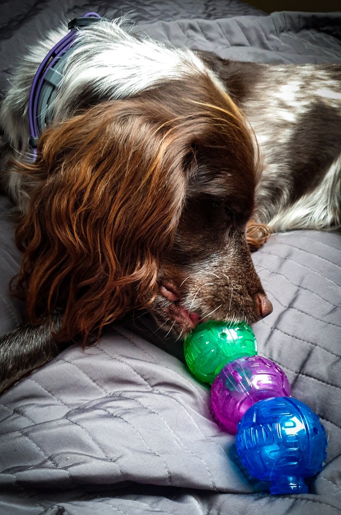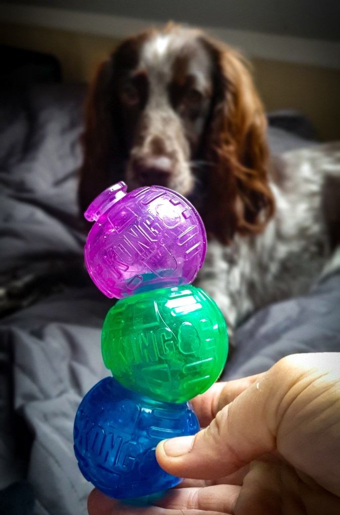 Interlocking balls that you can buy more of – pack has 3. Suits a small dog (up to 13kg) without strong jaws. The bigger size might be ok but this one is S.