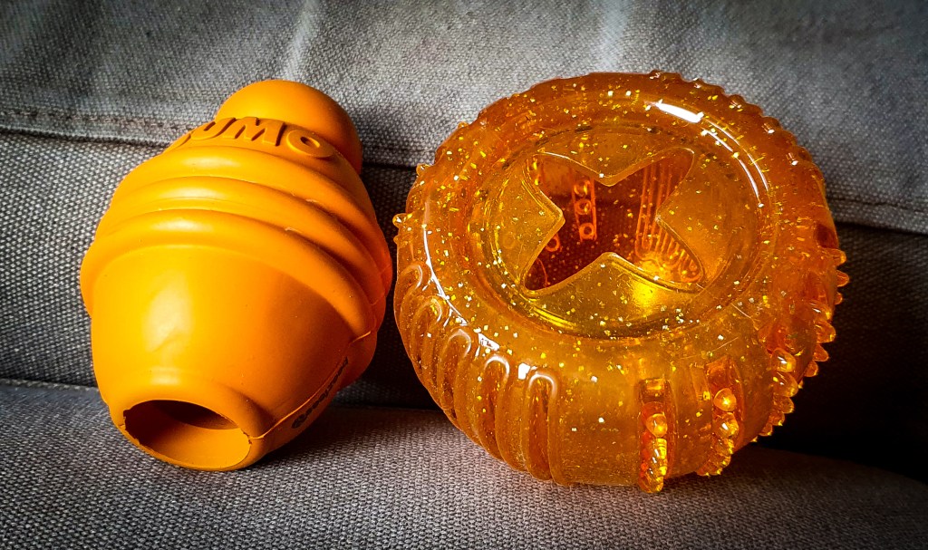 The Sumo Play is basically the same thing, but I find it easier to fill with wet food for freezing, and because it’s a different shape, dogs need to learn to hold it differently (i.e. more mental stimulation and paw dexterity).