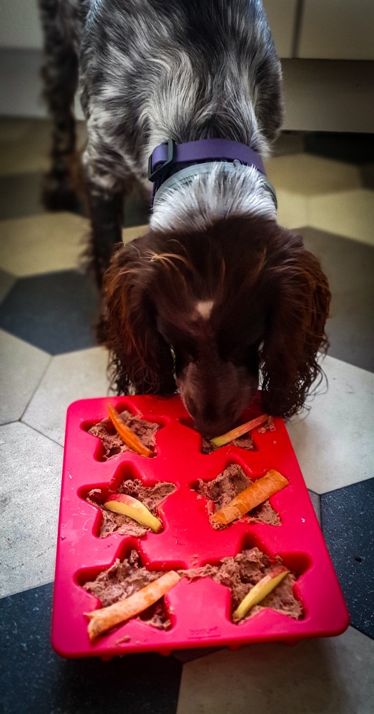 We do DIY raw but occasionally forget to order more before the pre-prepared boxes run out, so this is a sausage from the pet shop, just squeezed into what was within reach… a silicone muffin mould (that has never actually been used to make muffins).