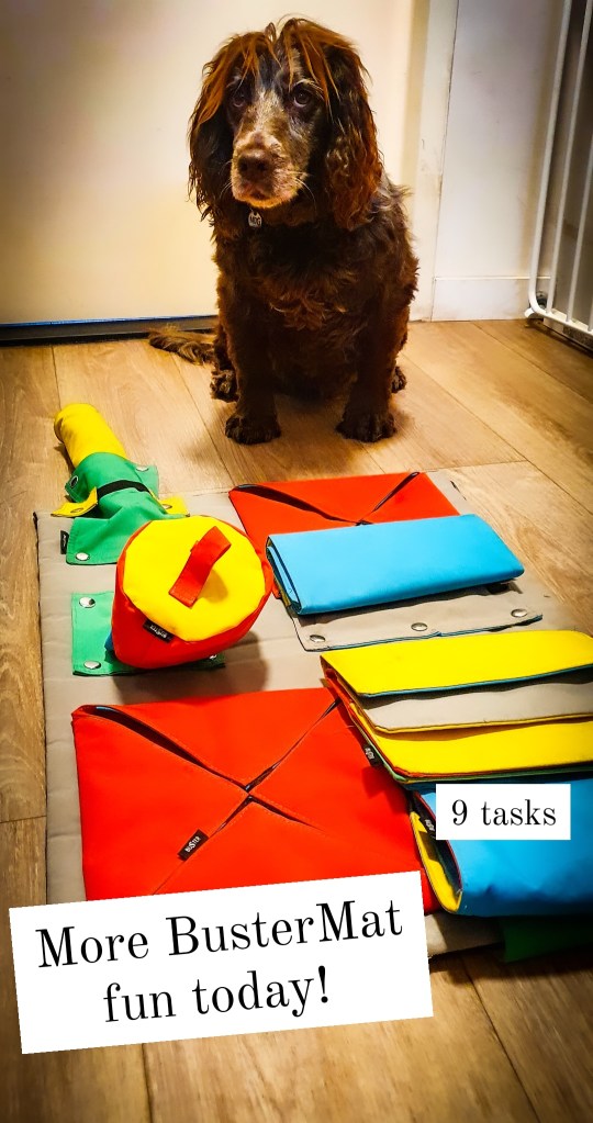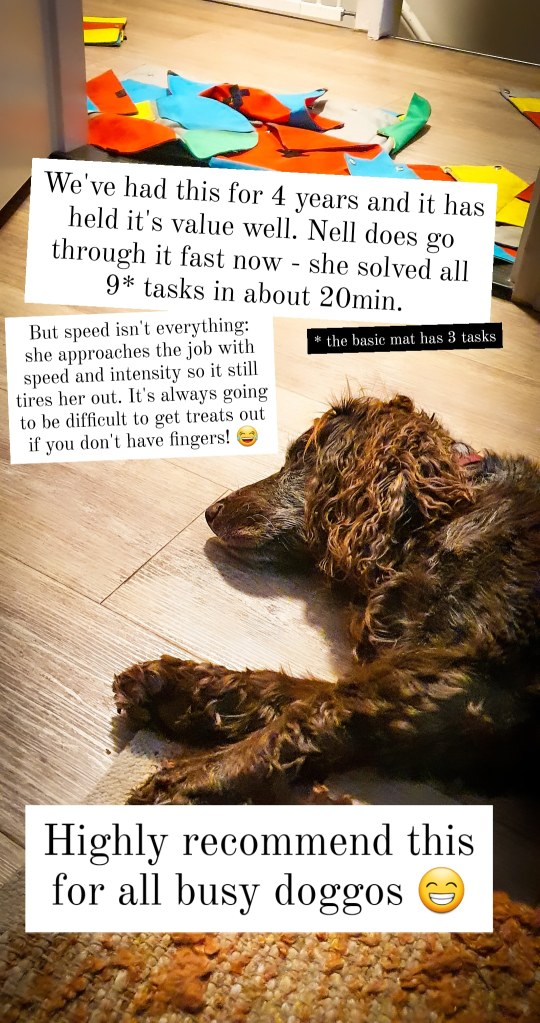 Buster ActivityMat is quite simply the best canine enrichment toy/game on the market anywhere – so many levels of difficulty give you an ability to build the games as the dog’s skills grow which gives it longevity. The initial investment is pretty high, which probably scares off many people – can it really be worth it? Yes, it can – we’ve had ours for four years and it hasn’t lost its appeal at all. Both dogs absolutely love it – so much so they’re always slightly vibrating from anticipation while watching us put it together!