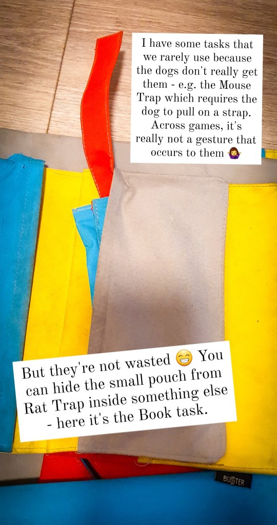 Over time I’ve bought all of the tasks and also lost some bits of the game – not to mention 2 tasks have never been to Nell’s liking so today I thought I’d show how to remix the tasks to add variety and creatively use even those tasks that the dog might not like. Read on – the pictures are from our Instagram stories!