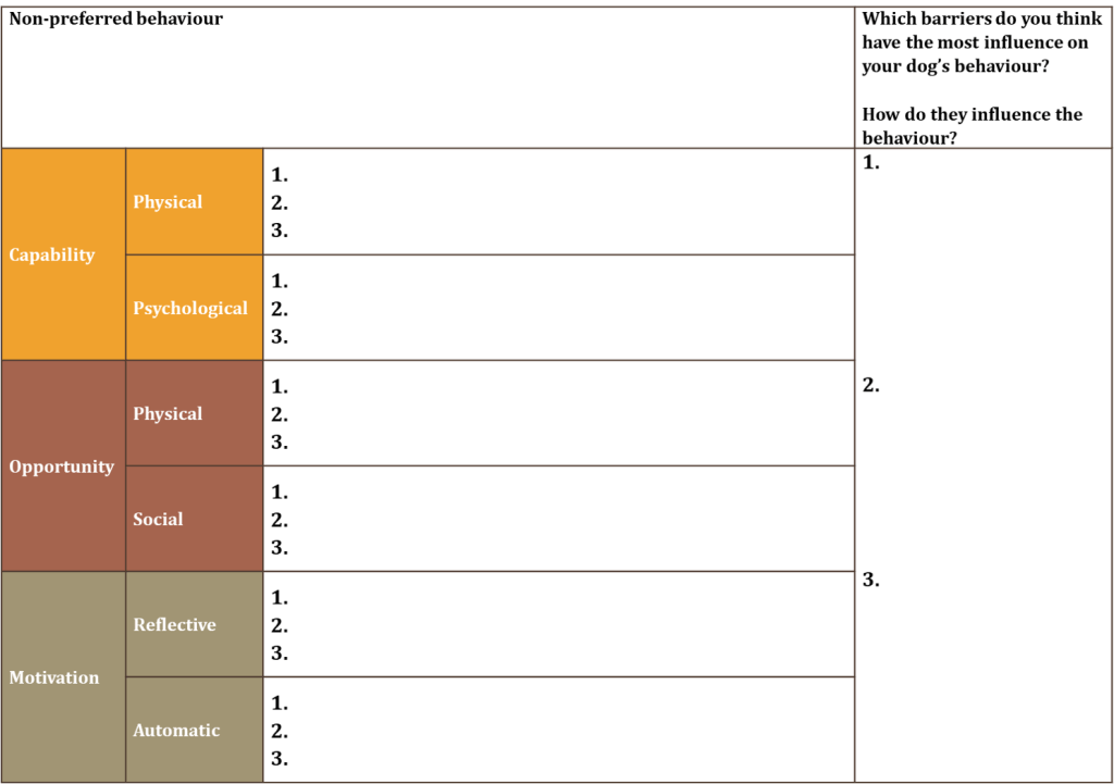 - N.B. In the original COM-B resources like time and money are also in this category – for a dog that might mean energy levels or trigger stacking but for simplicity I’d include that in their physical capability. You could also perhaps put being in possession or proximity to highly valuable items in this category!