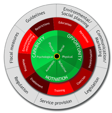 The original COM-B model is the core part of a larger entity – the Behaviour Change Wheel which was developed from 19 frameworks of behaviour change