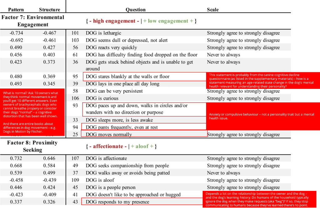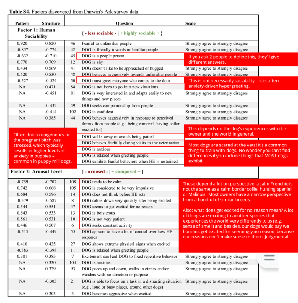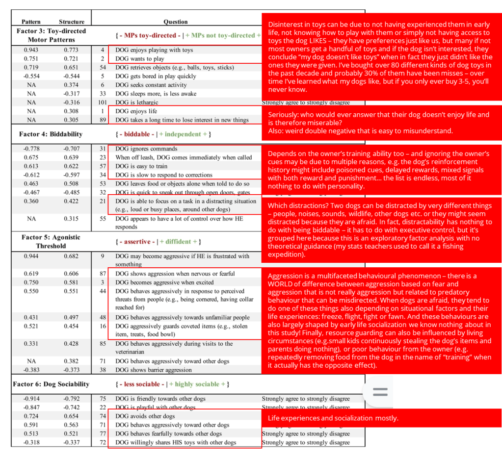 The last critique from me (for now) is that it’s very strange they mixed and matched the questions, even though there are several validated & widely used temperament assessment scales in canine science. As such, it’s impossible to connect this research to the rest of the literature – reducing its contribution.