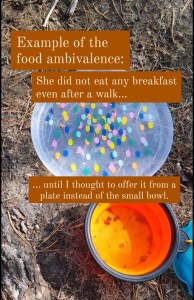 Forcing a human to eat certain foods in any of these three situations would seem unethical – so why do we consider it appropriate to recommend such approaches in dogs? I understand and admit that it is tempting because the opposite is often highly inconvenient to me and causes a lot of extra work – it would be so much easier to just keep it simple for myself and coerce Grace into what I want her to do when it comes to food (both meals and snacks).