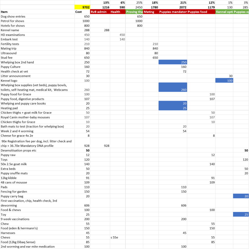 (Costs in blue cells are “assets” we can keep for another litter, if we ever do one)