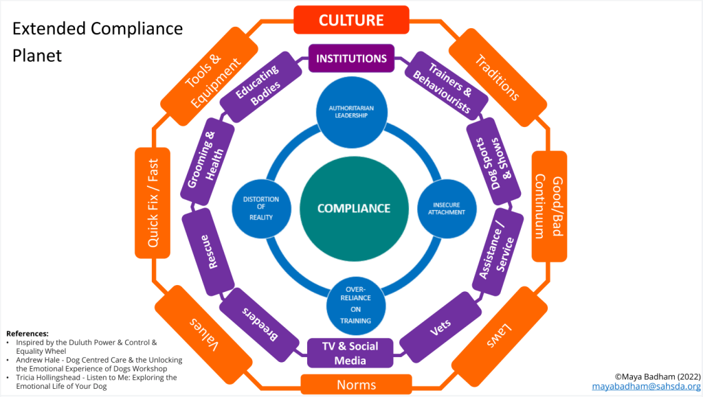 - This perspective aligns with traditional views that humans have dominion over animals, justified by a perceived absence of shared emotional and cognitive capacities. It views the relationship with a dog as unidirectional where the dog is expected to conform to human desires, often at the expense of its natural behaviors and intrinsic needs. (Some might say that the Compliance Planet is aligned with toxic masculinity in dog training – a hot topic of late!)