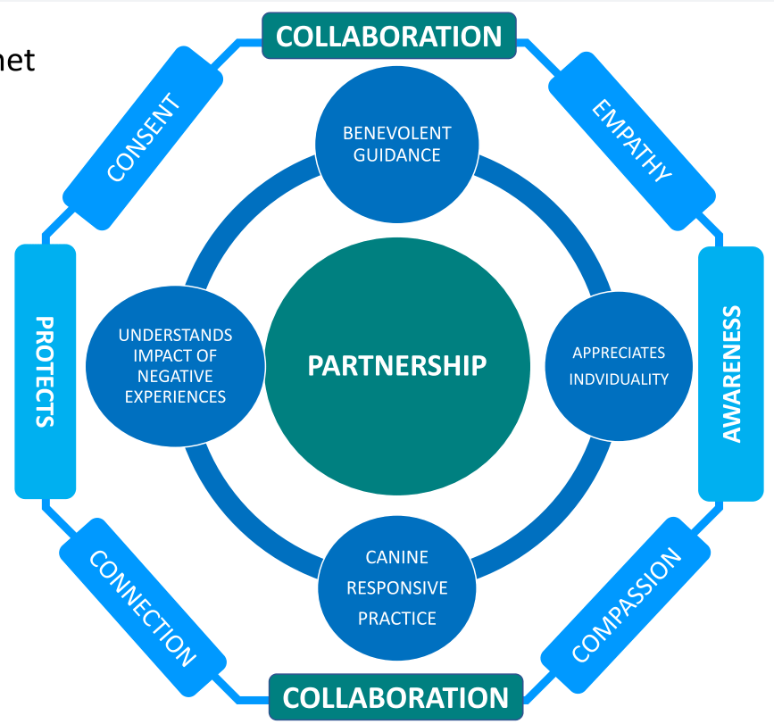 | Canine responsive practice | ACCEPTANCE of where the dog is at & their limitations. PROTECTS against/supports through negative experiences Provides emotional/physical/ environmental SAFETY & SECURITY Minimises RE-TRAUMATISATION Builds RESILIENCE Builds REGULATION Has realistic EXPECTATIONS Provides RELIEF EMPATHY |