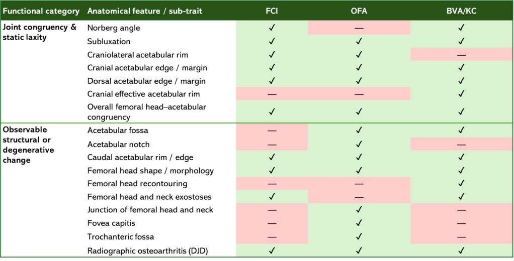 Although this section uses the FCI grading system as its primary example, the same conceptual limitation applies to other commonly used hip screening schemes, including OFA and BVA/KC. While these systems differ in format and scoring, they assess largely overlapping anatomical features and similarly combine indicators of joint laxity with visible structural or degenerative change into a single score or grade – click below for detailed information and a summary table.