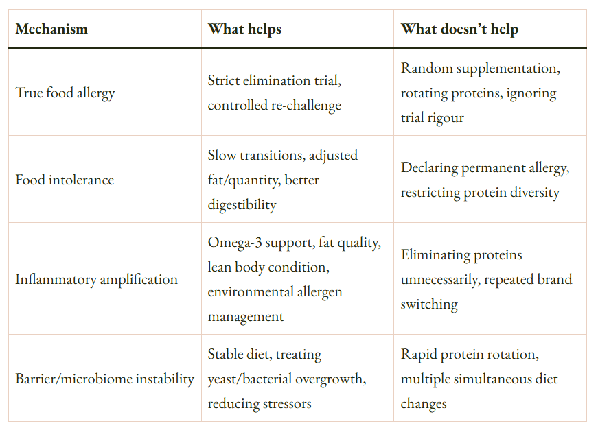 The most useful thing to understand before changing anything is that most dogs with food-related symptoms are dealing with inflammatory amplification, barrier instability, or intolerance rather than true protein-specific allergy, and none of those three mechanisms require a novel protein elimination trial to resolve. Protein-specific allergy is the mechanism most people assume when they hear “food reaction,” partly because it is the most concrete-sounding explanation and partly because it maps onto the most visible intervention: switch the protein. Yet… it is actually the least common of the four mechanisms covered in Part 1, and treating the other three as if they were allergy tends to make them more complicated rather than less.